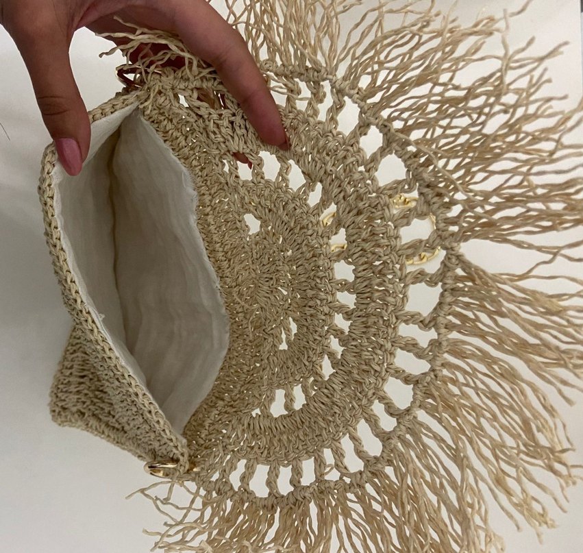 Nakışlı dantel detaylı, püsküllü bej örgü kadın portföy çanta. Bohem ve retro tarzda, hafif ve günlük kullanıma uygun.