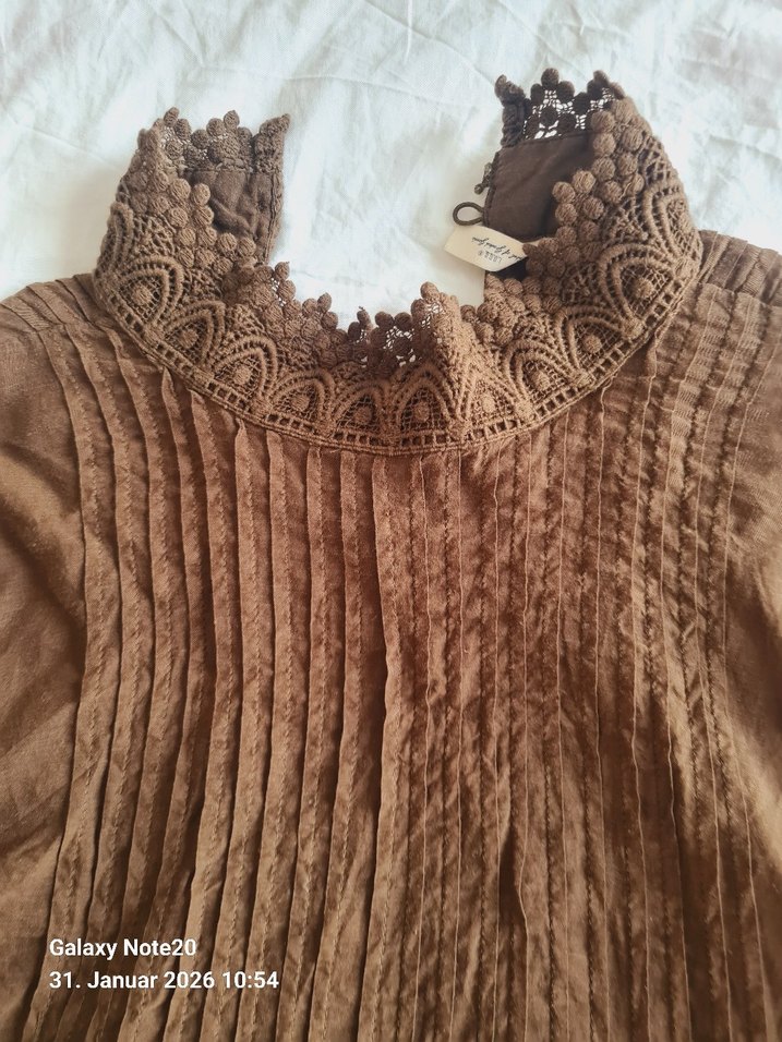 Bej keten bluz, yüksek yakalı ve örgü detaylıdır. Nakışlı desenlere sahip, uzun kollu ve bol kesim bohem tarzda. Günlük kullanıma uygundur.