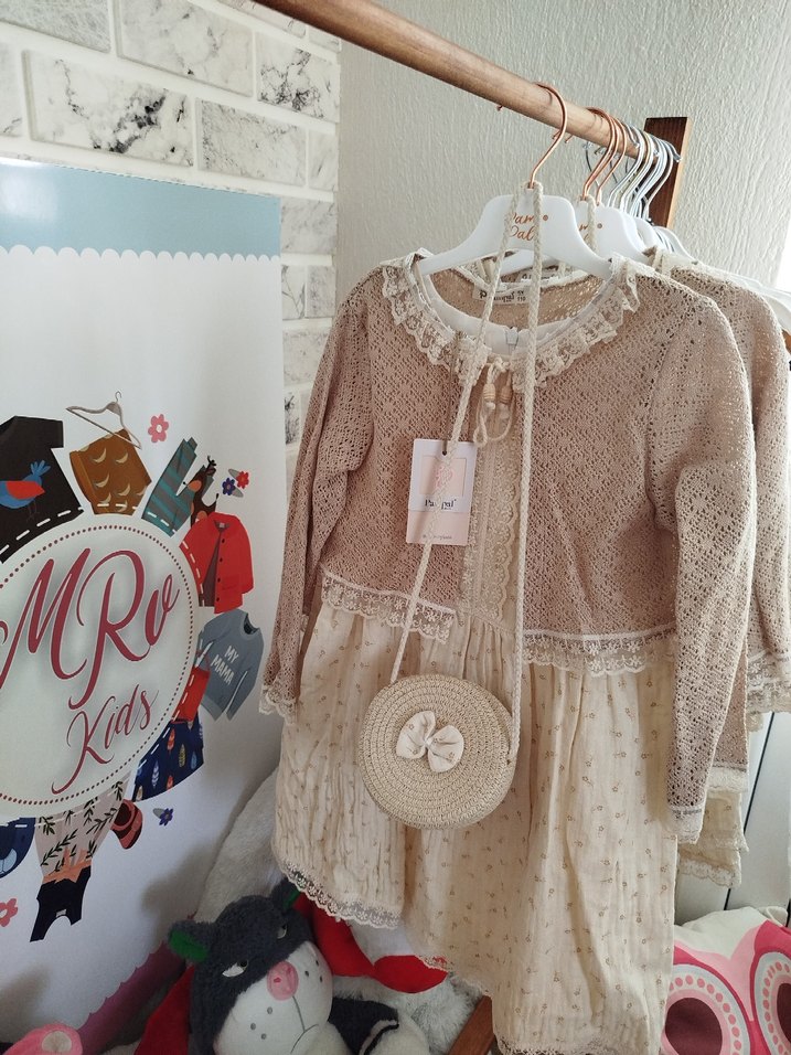 Bej renkli, nakışlı detaylara sahip, örgü kumaştan bol kesim kız elbisesi. Askılı kollu ve bohem stil için uygundur. çanta dahildir 2 yaş mevcut