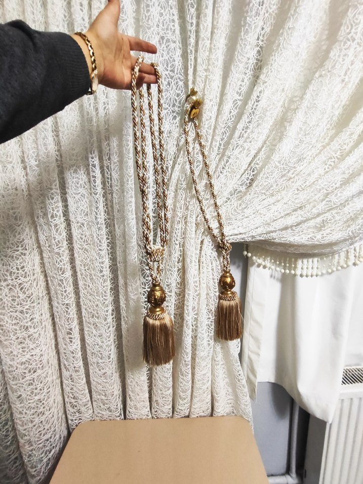 Nakışlı desenli, açık bej bohem perde, dekoratif püsküllerle tamamlanmıştır. Odaya yumuşak ve dokulu bir görünüm katar.