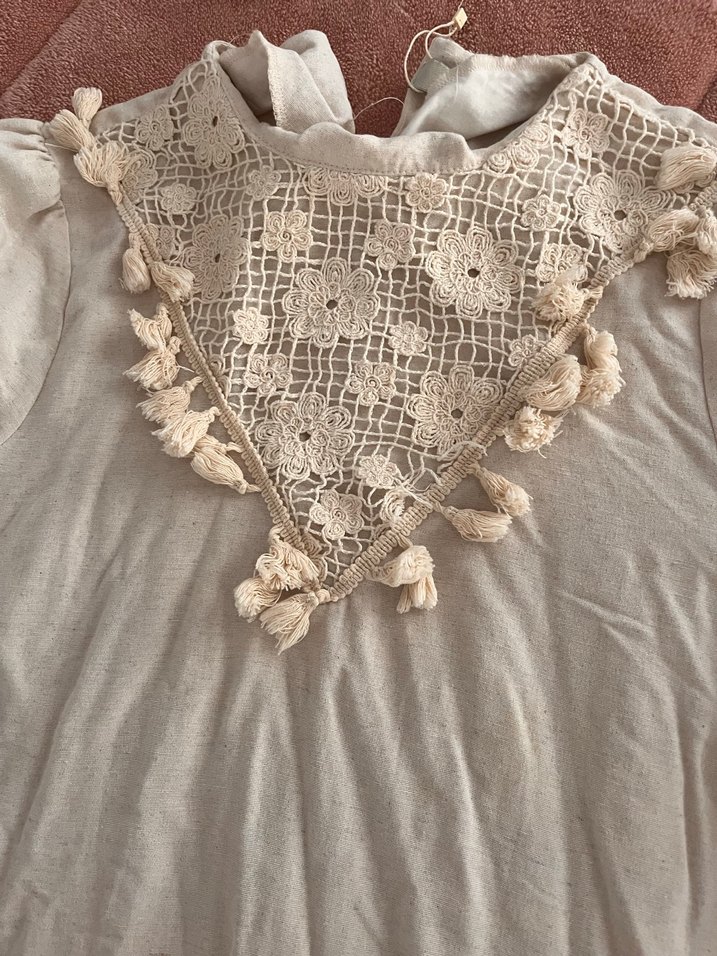 Nakışlı dantel ve püsküllerle süslenmiş bej kponçosu. Yumuşak dokulu, bol kesim ve tekne yaka ile bohem tarzı sunar.