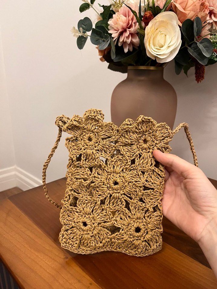 Bej renkli, çiçek desenli dantel örgüden yapılmış çapraz kadın çantası, bohem tarzda günlük kullanım için uygundur. El Emeği Örgü Çanta