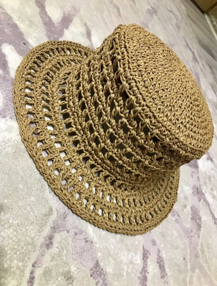 Bej renkte, dantel detaylı örgü kadın şapka. Bohem tarzda, hafif ve rahat bir görünüme sahip. Marka değildir. Kendim el emeğimle yaptım.