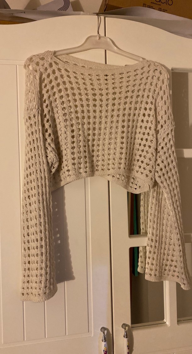 Bej renkli, tek renkli, örgü kumaştan yapılmış, kayık yaka ve bol kesime sahip kadın kazak. Uzun kollu ve midi uzunlukta, rahat ve bohem tarzda günlük kullanım için uygun.