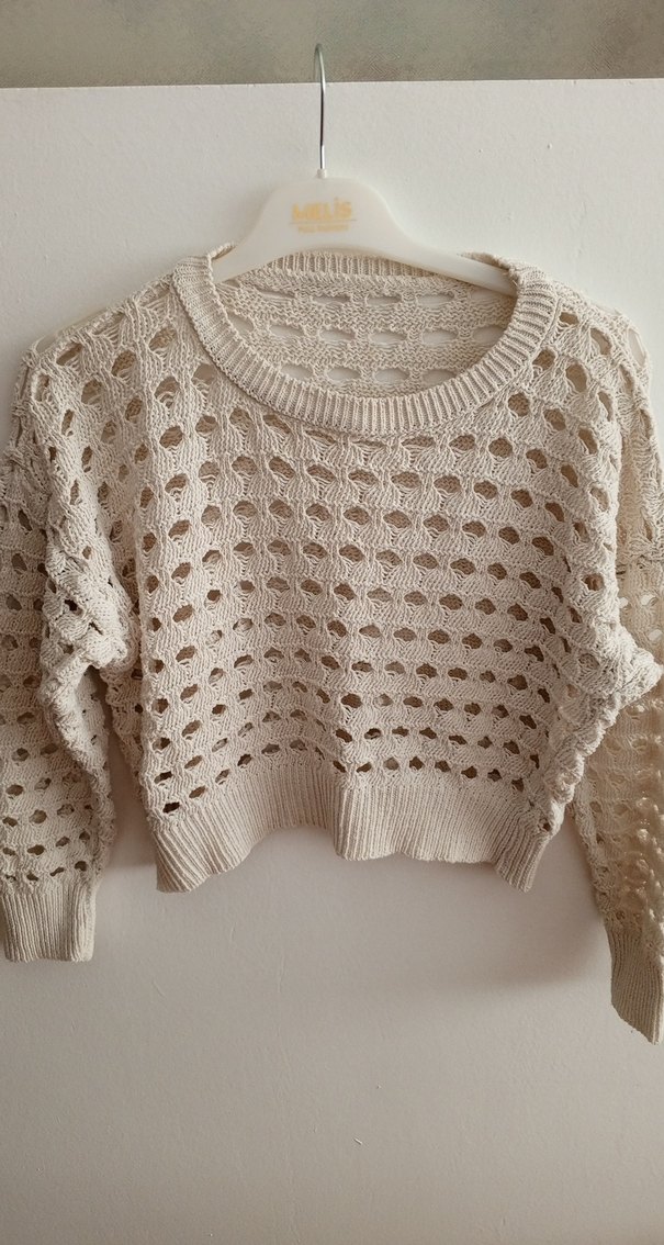 Bej renkli, uzun kollu, yuvarlak yakalı örgü kadın kazak. Bol kesim ve bohem tarzıyla günlük kullanıma uygundur. krem renk tam beyaz değil
