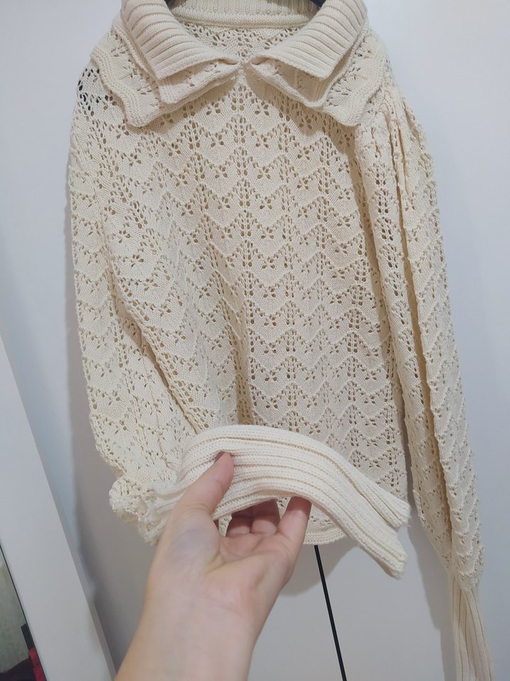 Bej renkte, bohem tarzda, uzun kollu, yüksek yakalı, örgü kumaştan, bol kesim kadın kazak. Rahat ve gündelik kullanıma uygun.