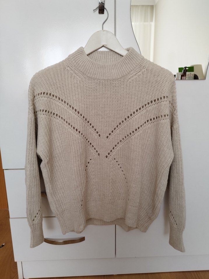 Bej renkli, yuvarlak yakalı, bol ve uzun kollu örgü kazak. Beyazı kendime yakistiramadigim için koydum. Defosu yok rahatlıkla alabilirsiniz.