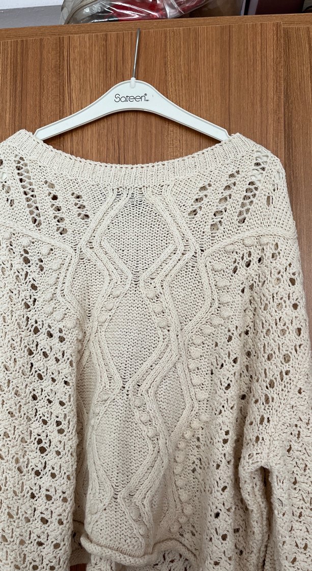 Bej renkli, yuvarlak yaka ve uzun kollu örgü kadın kazak. Bohem tarzda, bol kesim ve günlük kullanım için uygundur. Rahat ve örgü dokulu.
