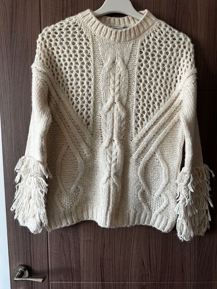 Bej renkli, bol kesim, uzun kollu ve bisiklet yaka örgü kadın kazak. Kol detaylarında püsküller bulunur, rahat ve bohem tarzda.