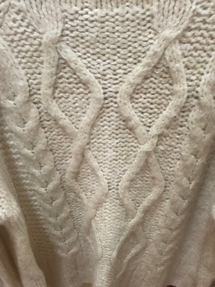 Bej renk, bohem tarzda, uzun kollu, yuvarlak yaka, örme dokulu, bol kesim kadın kazak. Günlük kullanıma uygun, rahat ve retro görünümlü.
