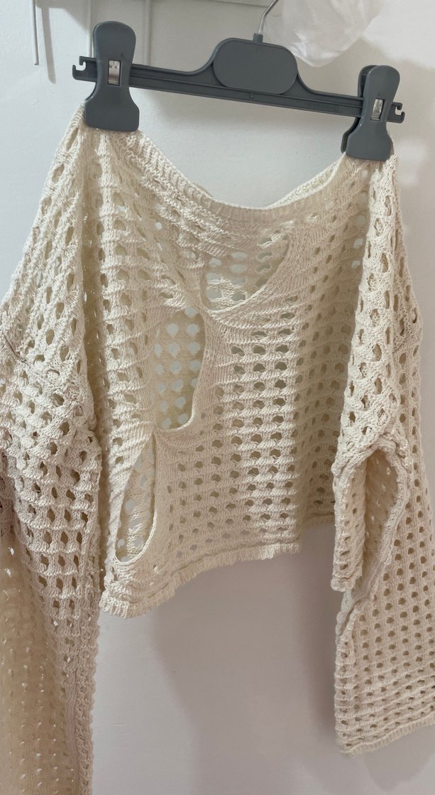 Bej renkli, gevşek kesim ve kısa boyda, yuvarlak yakalı örgü kadın kazak. Bohem tarzda, uzun kollu ve delikli örgü detaylı, günlük kullanıma uygun.