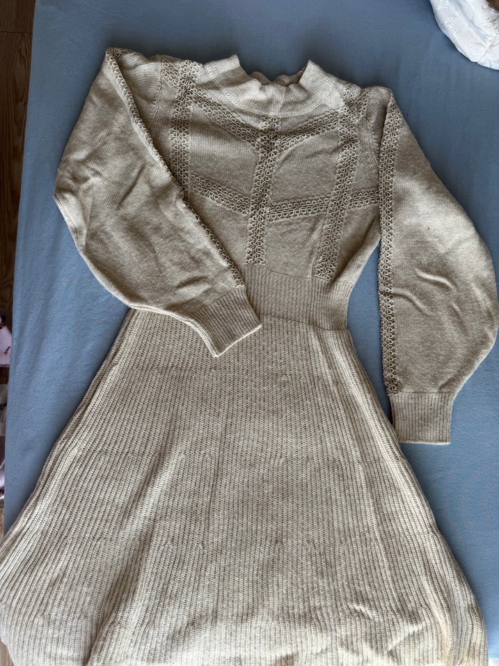 Bej renkli, örgü kumaştan yapılmış, bohem tarzda, uzun kollu ve beli oturan kadın triko elbise. Günlük kullanıma uygundur. ✨ yepyeni bir iki defa giyildi çok şık havalı