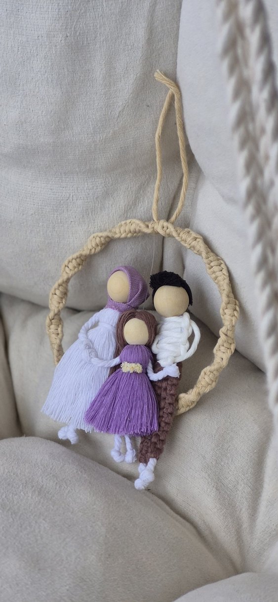 Bej renkte, pastel tonlarda, bohem tarzda püsküllü aile figürlü anahtarlık. Retro ve hippie havası taşır.