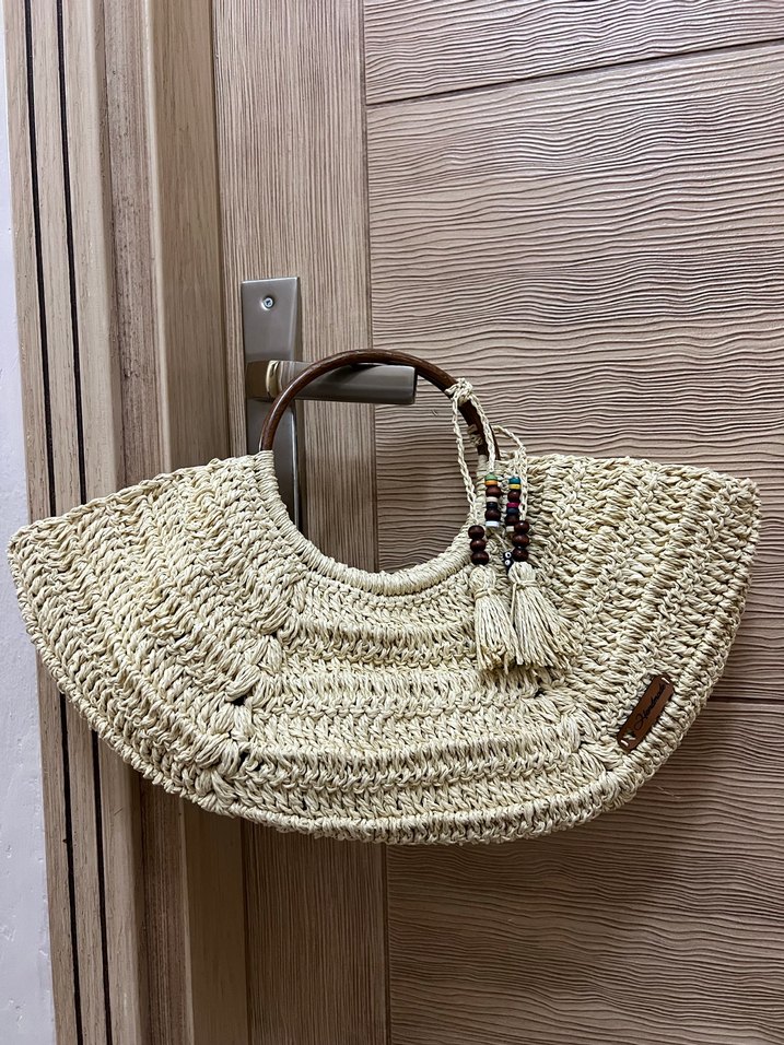 Püsküllü ve nakışlı detaylara sahip bej örgü kadın çanta, bohem stilde ve ahşap saplıdır. Günlük kullanıma uygundur. El Yapımıdır .