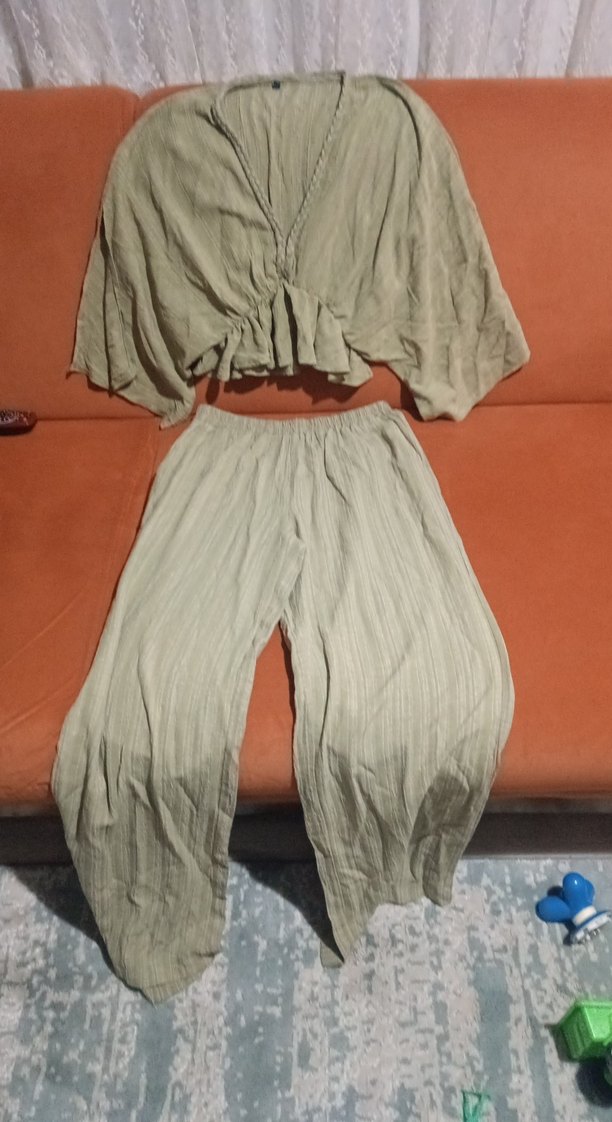 Bohem tarzda, bej renkli keten kumaştan, pilili ve salaş kesim kısa paça pantolon. Günlük kullanım için uygundur.