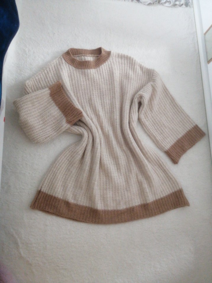 Bej renkli, kahverengi uçları olan, yuvarlak yakalı, uzun kollu, salaş ve midi boy triko kazak, günlük kullanıma uygun.