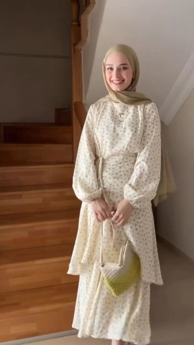 Bej renkli, yüksek yakalı, uzun kollu ve salaş kesimli uzun elbise. Sentetik kumaştan, drapeli ve hafif batik desenli, günlük kullanıma uygun bohem tarzda.