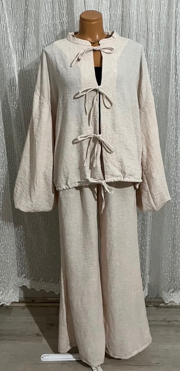 Salaş kesim, uzun kollu ve bağcıklı bej bornoz. Yumuşak, desensiz kumaştan, rahat bohem tarzda.