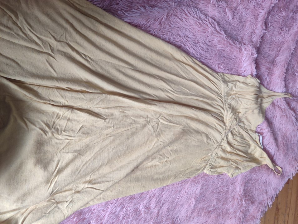 Bej renkte, uzun boylu kadın elbisesi bol kesim ve kolsuz tasarıma sahiptir. Pastel tonu ve desensiz yapısıyla bohem ve rahat bir stil sunar. S bedene uyumludur