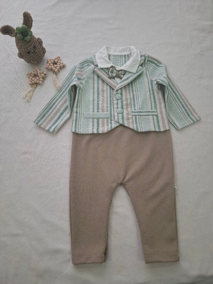 Notch yaka ve uzun kollu, yumuşak triko kumaştan yapılmış bebek tulumu. Düğmeli detaylı, bohem tarzda, bej alt ve çizgili üst kısmı vardır.