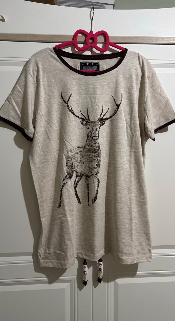 Bej renkli, pamuklu, bol kesim erkek tişörtü, kısa kollu ve yuvarlak yaka. Üzerinde geyik baskısı bulunur, günlük kullanıma uygundur.