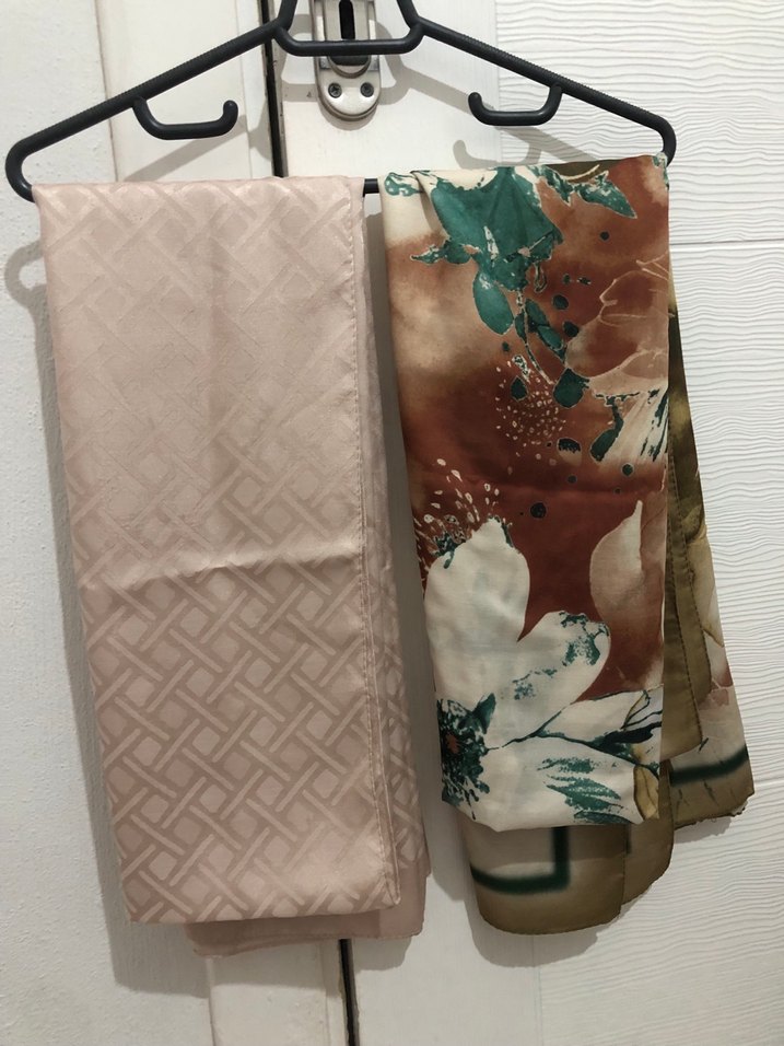 Bej renkli, ipek dokulu, drapeli tasarıma sahip kadın fular. Açık renkli, bohem tarzda, düz ve çiçek desenleri bir arada.