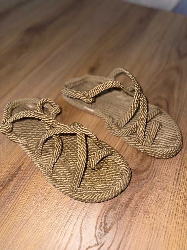 Bej renkte, bohem tarzda, halat görünümlü bantlara sahip kadın dolgu topuklu sandalet. Kauçuk malzemeden üretilmiş, hafif ve gündelik kullanıma uygun.