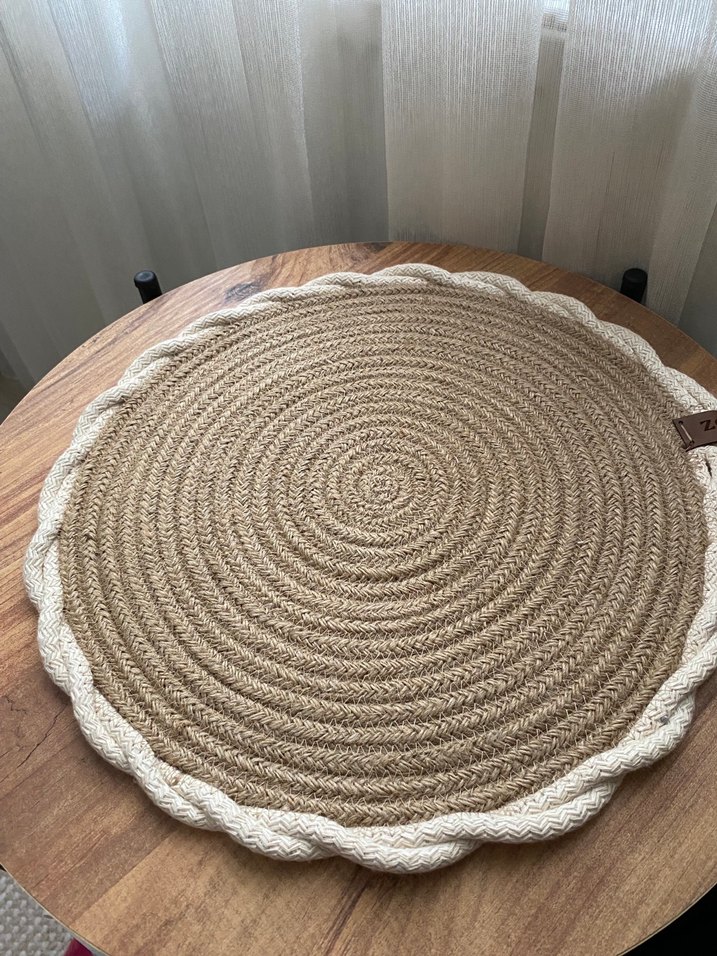 Gri tonlarda örgü bordürlü, doğal bohem tarzda bej yuvarlak halı. Dokulu yüzeyiyle mekana sıcaklık katar.