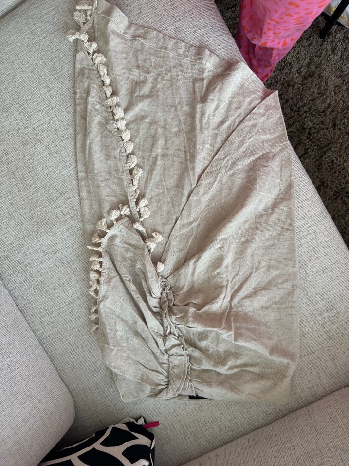 Bej renkli, yumuşak keten kumaştan yapılmış, bol kesim ve drapeli uzun hamile eteği. Bohem tarzda, günlük kullanıma uygundur.