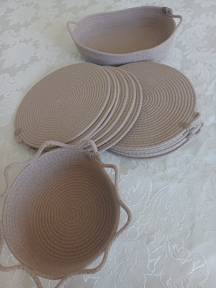 Yumuşak ve doğal dokulu malzemeden yapılmış bej bohem tarzda yuvarlak tabak altlıkları ve küçük sepetler seti.