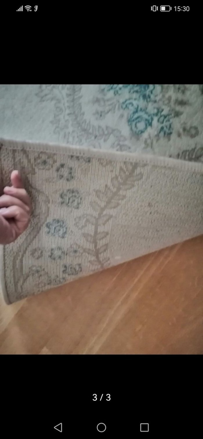 Bej renkte, gri baskılı desene sahip bohem tarzda halı.