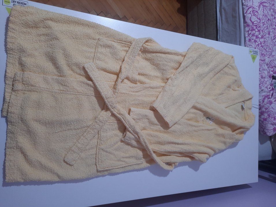 Bej renkli, bohem tarzda, desen içermeyen, yumuşak dokulu bornoz. Bel kemeri ve ön cepleri bulunur.
