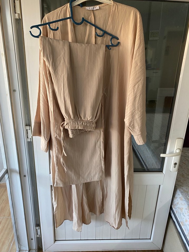 Bej rengi, bohem tarzda, desen içermeyen yumuşak kumaştan bornoz ve elastik bel detaylı pantolon takımıdır. Rahat kullanım sağlar.