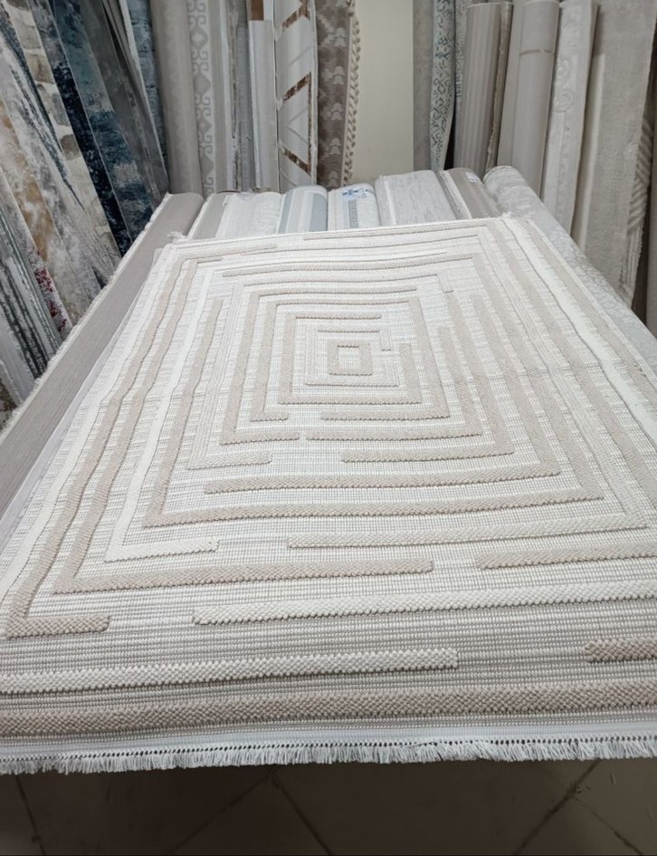 Açık bej renkte, bohem tarzında dokuma halı. Kenarlarında püsküller bulunan doğal dokusu ile mekana sıcaklık katar. 160 en 230 mt boyunda yeni sıfır alındılar 2 adet var aynısı