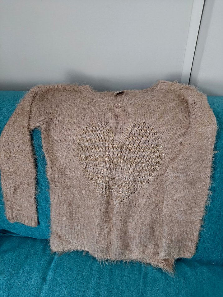 Bej renkte, uzun kollu ve yuvarlak yakalı, bol kesim örgü kazak. Ön kısmında ince kalp deseni bulunur, kısa boyda ve günlük kullanım için uygundur.