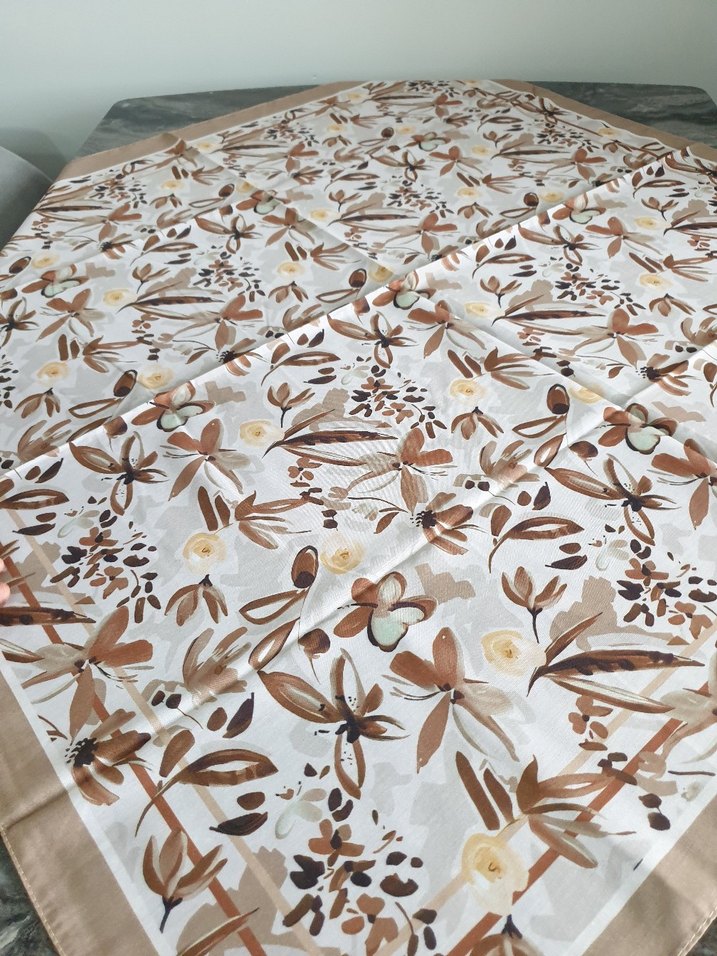 Bej renkli, hafif bohem tarzında, yumuşak sentetik kumaştan kadın fular. Üzerinde çiçek desenleri ve drapeli tasarım bulunur.