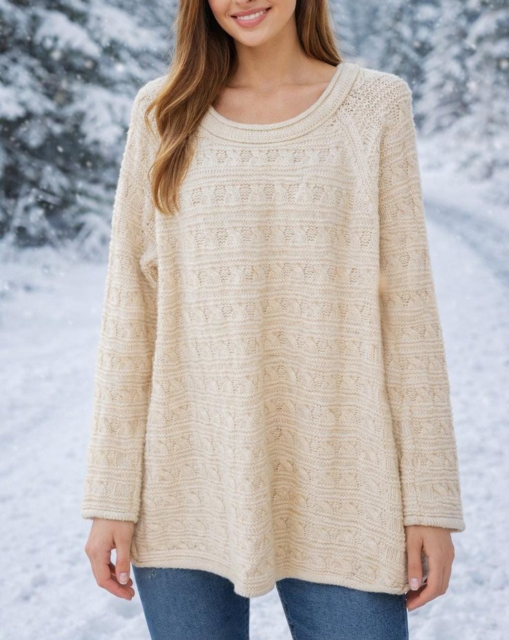 Bej renkli, yumuşak triko kumaştan yapılmış, uzun kollu ve yuvarlak yakalı bol kesim kadın kazak. Günlük kullanım için bohem tarzda rahat bir model.