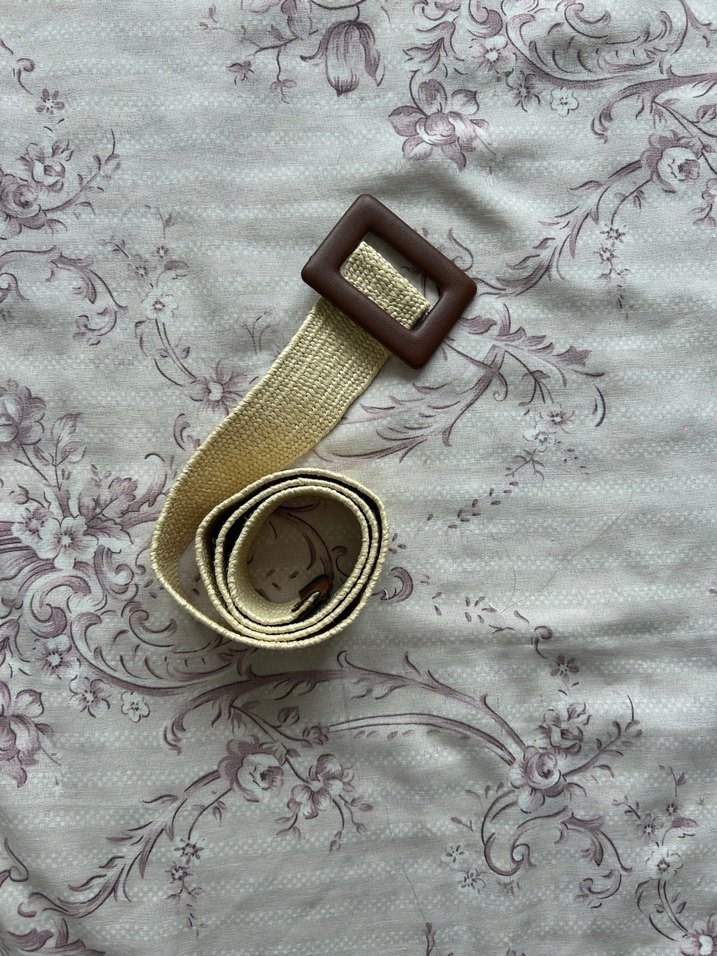 Sentetik kumaştan üretilmiş, kahverengi dikdörtgen tokalı, açık bej renkli bohem tarzı kemer. Retro ve hippie stillerine uygundur.