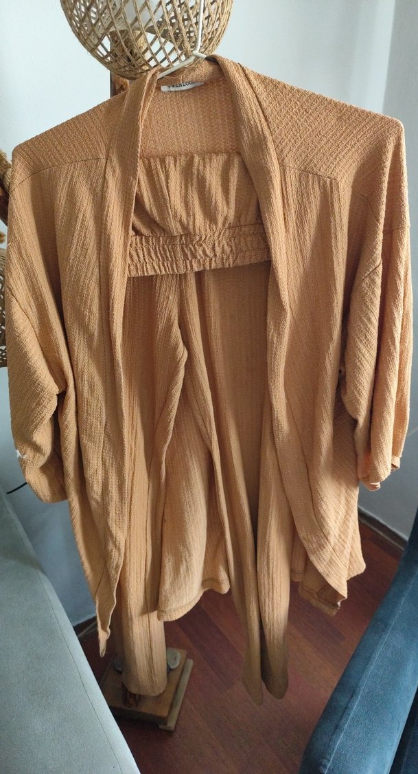 Bej renkte, bohem tarzda, yumuşak dokulu ve rahat kesimli, desensiz kimono takimKonforlu kullanım sağlar.