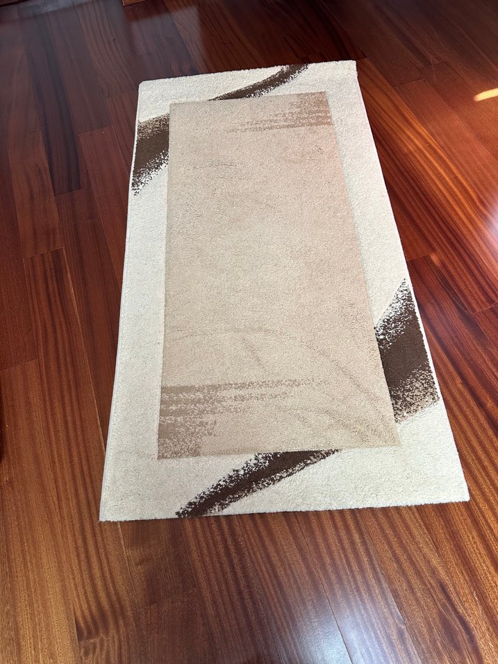 Bej bohem tarzı, parlak desenli halı. Wonderwool Friese markası, 80x150 cm ölçülerinde, detaylı işçilikli halı. Yıkanması gerekiyor