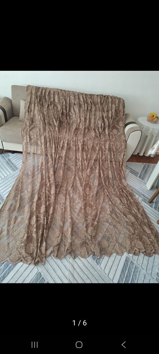 Bej renkte, bohem tarzda ve ince dantel desenli tül perde, mekana yumuşak ve şık bir dokunuş katıyor. Bir kac sene kullanıldı yepyenidir