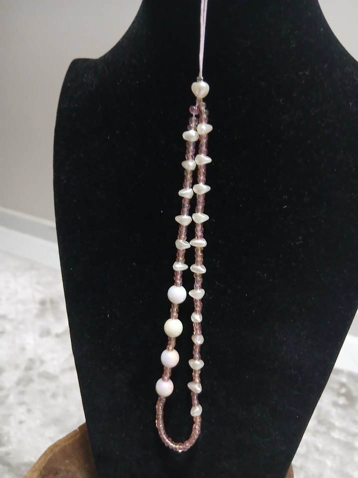 Bej renkte, ince ip üzerinde düzenlenmiş hafif ve bohem telefon charm Minimalist ve şık bir tasarıma sahiptir.