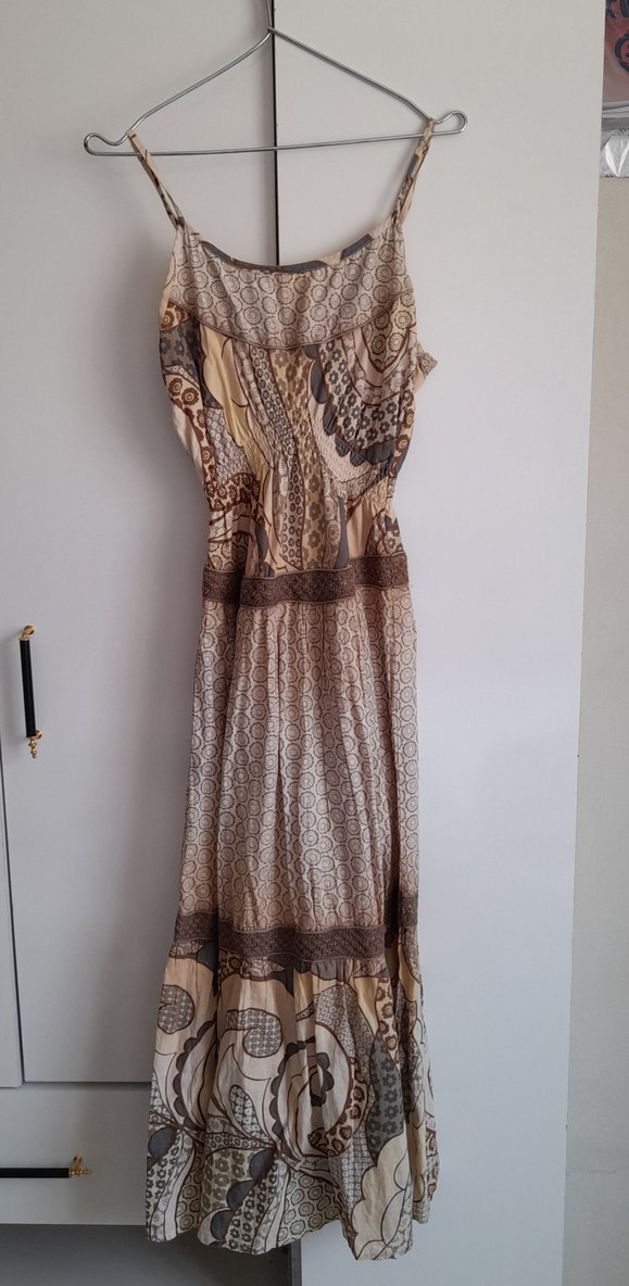 Bej renkli, uzun bohem elbise.bol kesim ve sentetik kumaştan yapılmıştır. Günlük kullanım için uygundur.
