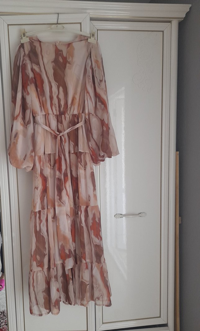 kahve bej renk tondadir beli lastikli bağcıkli balon kol bilek kısmı lasttikli kat kat dikimiyle astarlidir iki defa giyildi günlük olarak kulanilir dugunde nişan da giyilir ağir ve şık elbisedir aldiğimdan uygun ekledim