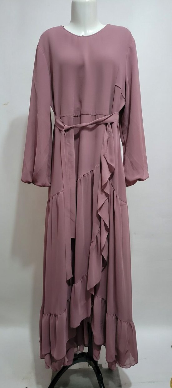 Bej renk, yüksek yakalı ve bol kesim uzun elbise. Fırfır detaylı, askılı kollu ve minimalist bohem tarzında, sentetik kumaştan üretilmiştir. Günlük kullanım için uygundur.