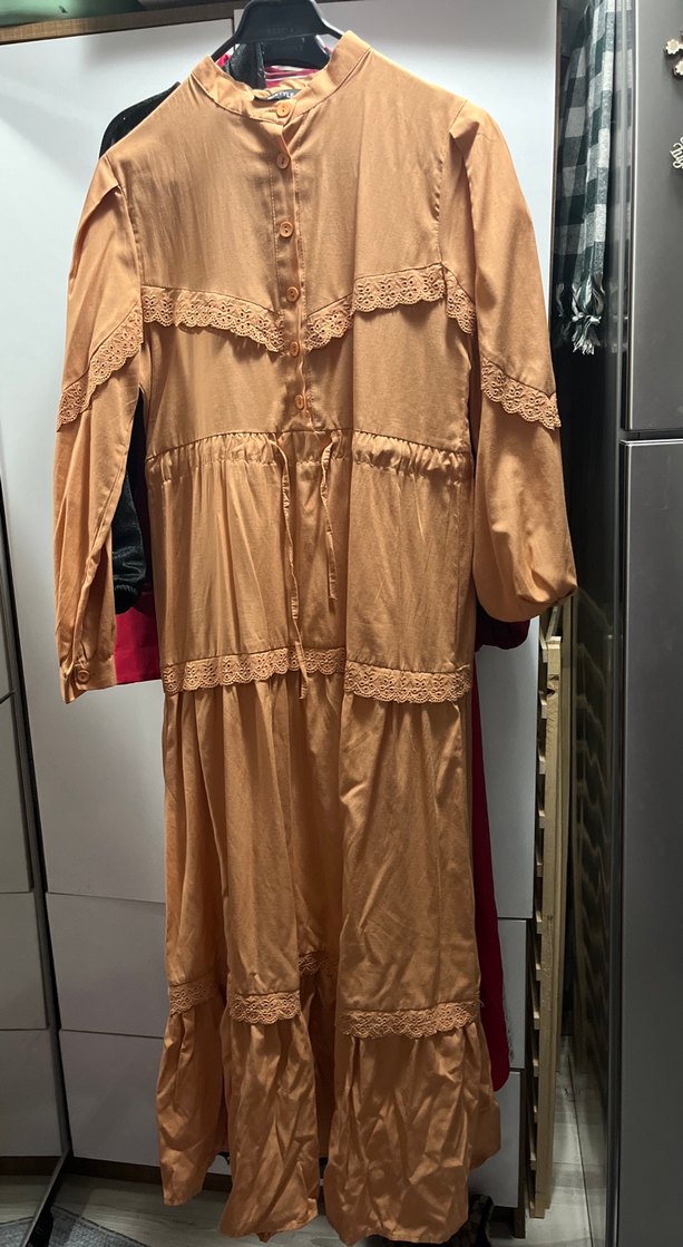 Bej renkli, bol kesim uzun elbise, fırfır detaylı, yüksek yakalı ve uzun kolludur. Parlak sentetik kumaştan, bohem tarzında.
