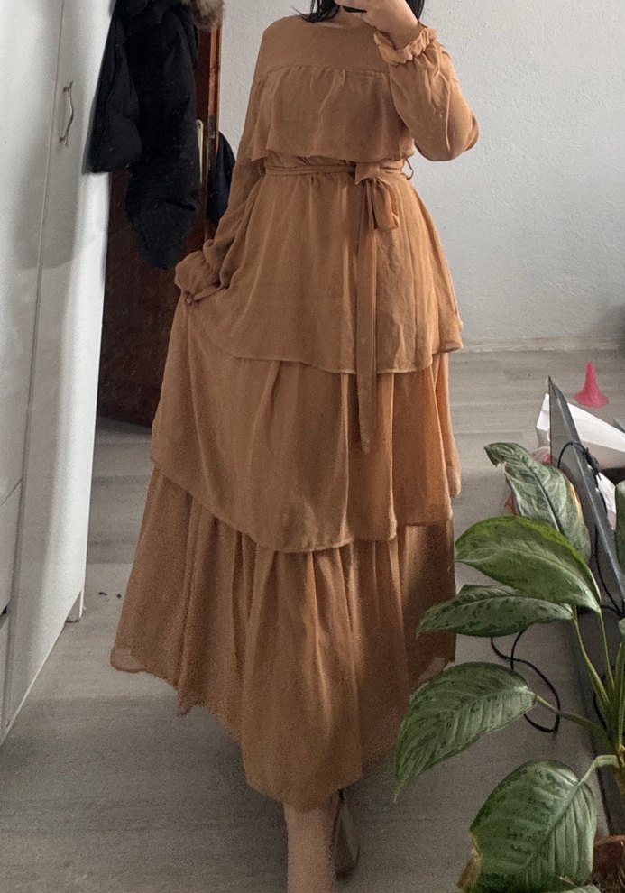 Yumuşak keten kumaştan, yüksek yakalı, askılı kollu, bol kesim bej uzun elbise, kat kat fırfırlı. Bohem tarzına uygun.