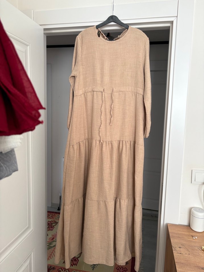 Bej keten uzun elbise, bol kesim, yuvarlak yaka ve ince askılı, günlük kullanıma uygun bohem tarzı yansıtıyor.