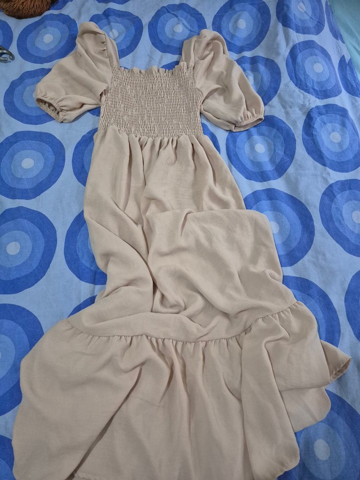 Bej renkte, keten kumaştan yapılmış, bol kesim ve drapeli uzun elbise. V yaka ve askılı kollara sahip, bohem tarzda günlük kullanım için uygun.