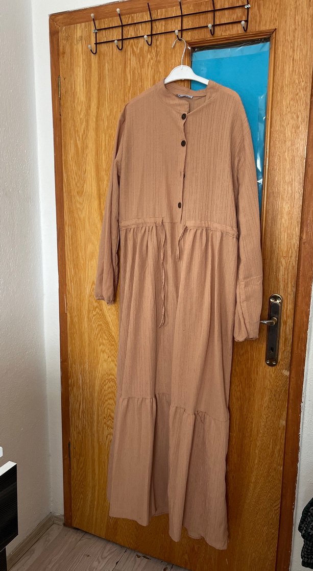 Bej renk, keten kumaştan, uzun kollu, düğmeli ve yüksek yakalı bol kesim bohem tarz elbise.